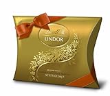 Lindt's holiday Lindor Assorted Pillow Box in gold contains an assortment of 22 milk, dark and white chocolate Lindor truffles in this festive ready to give gift box with matching bow.