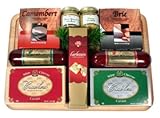 This gourmet gift commands an American Hardwood cutting board, measuring 9 x 13in. and grooved around the edges. The gift is loaded with gourmet treats sure to please: 5 oz of Smoked Beef Salami 5 oz of All Beef Summer Sausage 7.5oz of our Most Popular Cheese Spreads (Bacon and Chives Flavored Cheddar and Brie) Assorted Fruit Flavored Bon Bons 2 Jars of mustard in assorted flavors 2 Boxes of Wine-Cheese-Caviar Crackers A 9 x 13in Hardwood Cutting Board Enhancements and ribbon Tomato & Basil Cheese